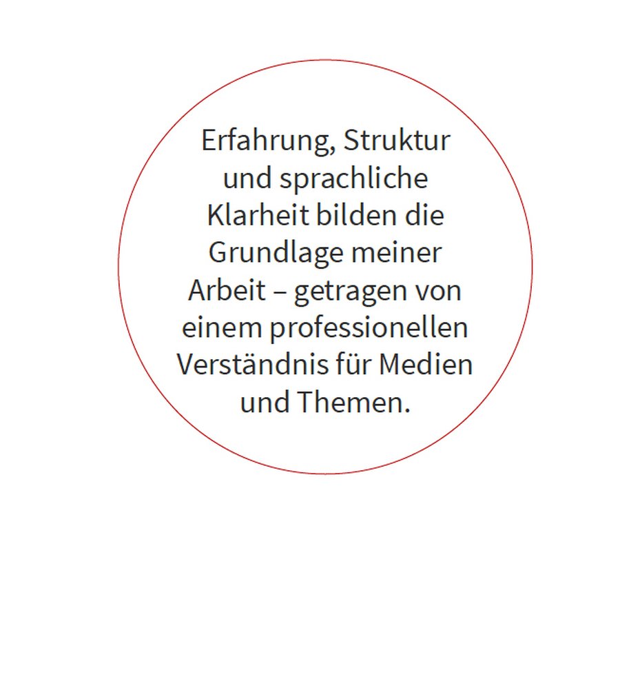 Meine Arbeit ist geprägt von konzeptionellem Denken, sprachlicher Präzision und einem klaren Blick für das Wesentliche. Aus vorhandenen Materialien, Gesprächen und Themenfeldern entwickle ich tragfähige Botschaften, strukturiere komplexe Zusammenhänge und bringe Inhalte in eine Form, die nachvollziehbar und anschlussfähig ist: für Medien, Zielgruppen und weitere Kommunikation.