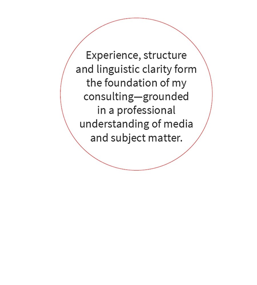 My work is shaped by conceptual thinking, linguistic precision and a clear focus on what matters. From existing materials, conversations and thematic fields, I develop robust key messages, structure complex interrelations and shape content in a way that is coherent and connectable—for media, target audiences and further communication.
